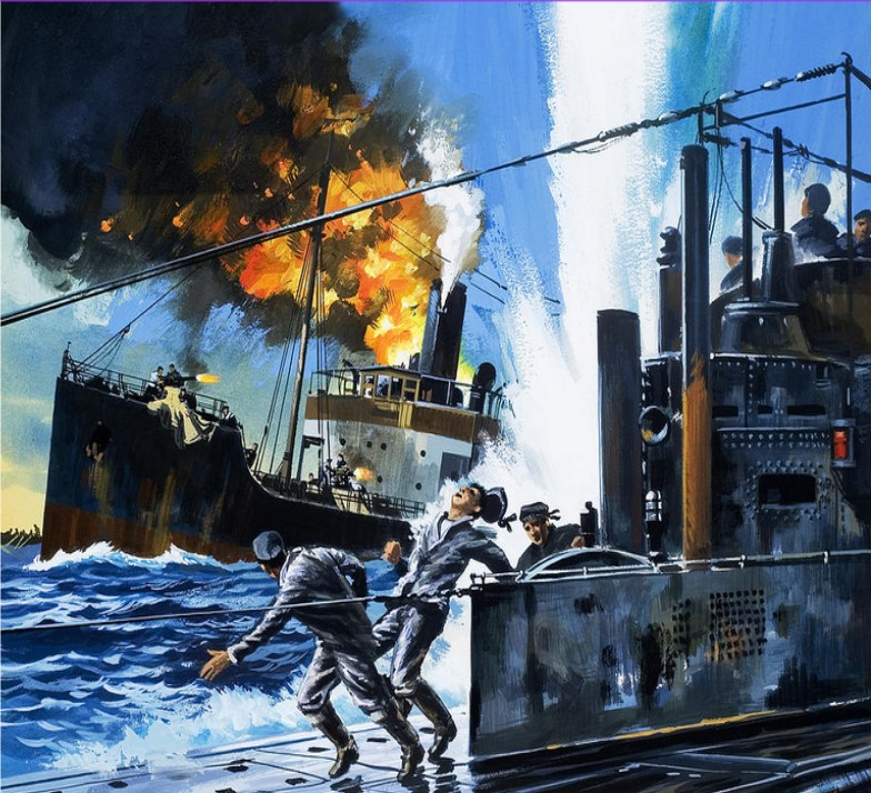 Versenkung der britischen Panzerkreuzer CRESSY, HOGUE und ABOUKIR durch U 9, Kapitänleutnant Otto Weddingen, am 22. September 1914 vor der niederländischen Küste. Nach einer Originalzeichnung von Hans Bohrdt |